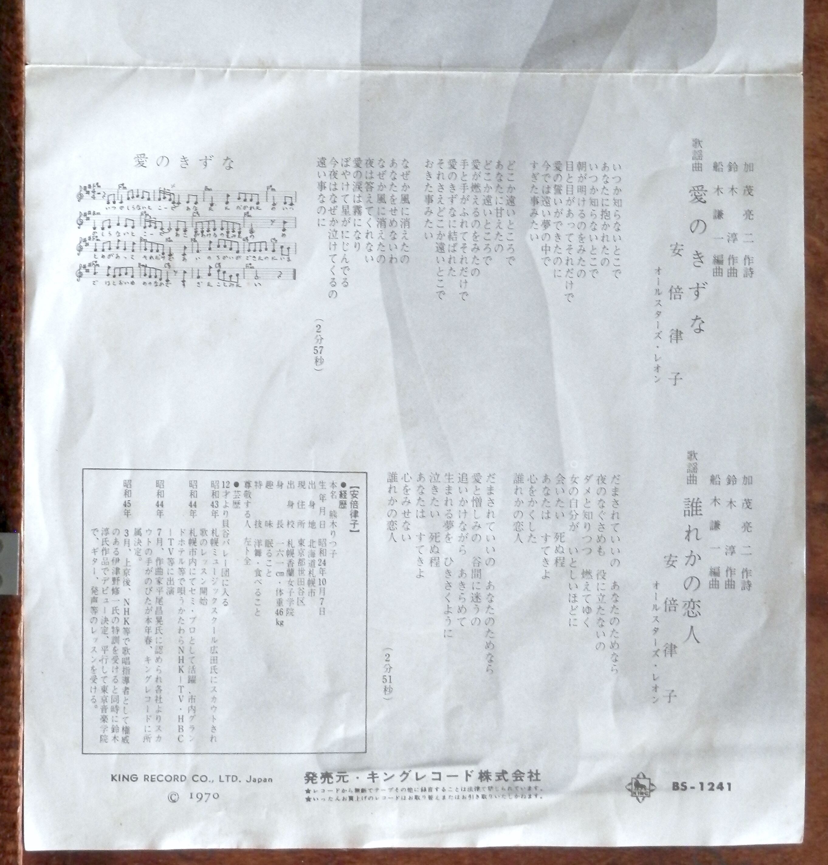 '70【EP】安倍律子 - 愛のきずな *ピンナップジャケ
