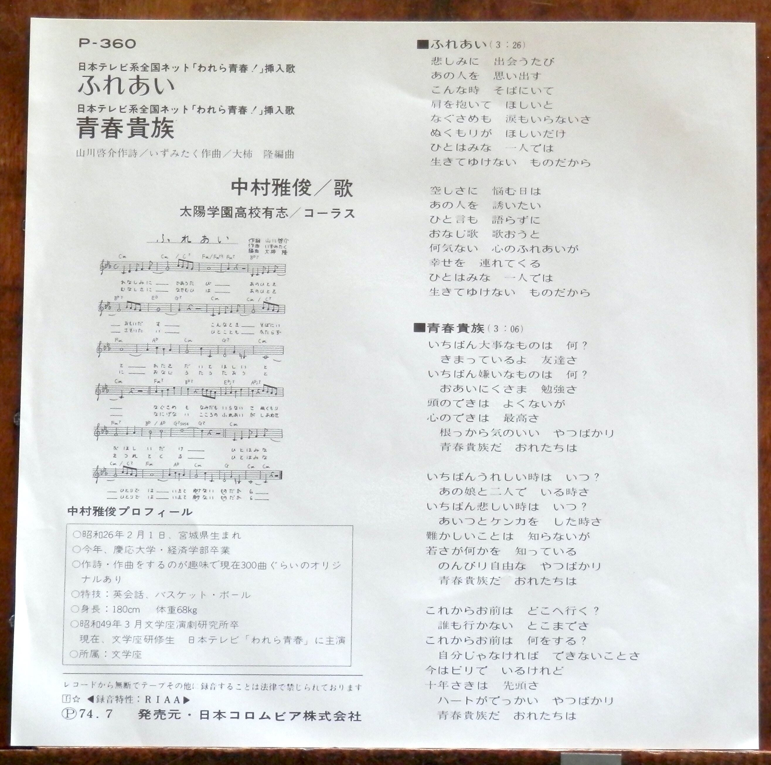 '74【EP】中村雅俊 - ふれあい 「われら青春」