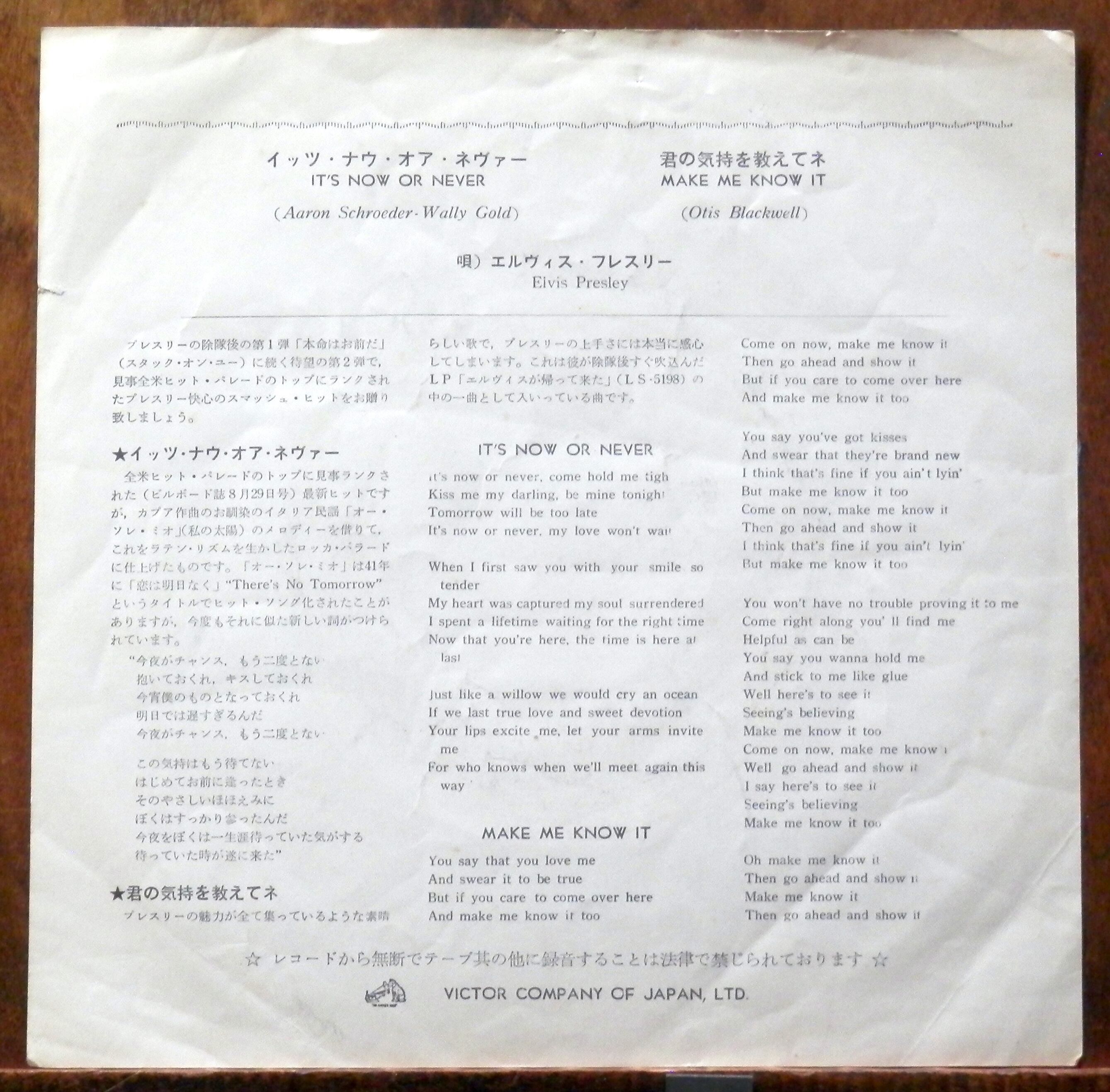 '60【EP】エルヴィス・プレスリー - イッツ・ナウ・オア・ネヴァー