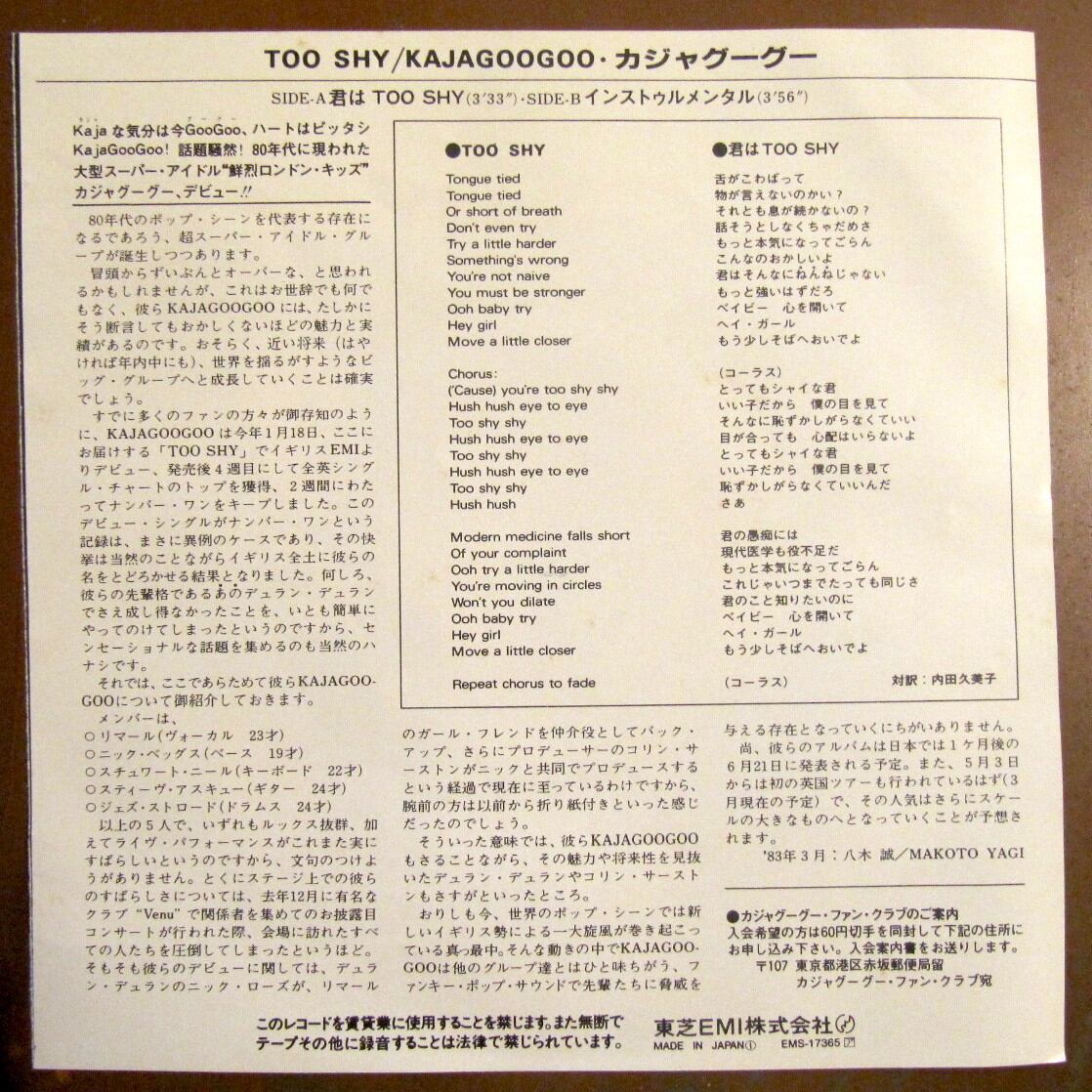 83年【EP】カジャグーグー / 君はTOO SHY